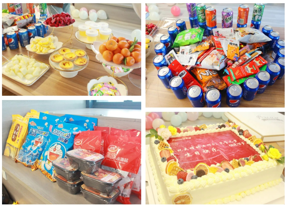 在生日会上,我们准备了琳琅满目的水果零食,甜蜜蛋糕,表达了对生日伙伴暖暖的关怀。