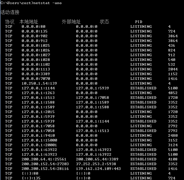 使用命令 netstat -ano 查看当前的网络连接,排查可疑的服务、端口,外连的IP。如发现netstat定位出的pid有问题,可再通过tasklist命令进一步追踪该可疑程序。