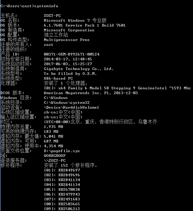 使用命令systeminfo,查看系统版本信息以及补丁信息,确认当前系统是否存在漏洞、是否已经打了相应的补丁。