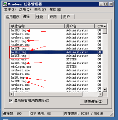 进程名字异常是指某些进程的名字是随机产生的,因此高度可疑,例如:某感染环境,打开任务管理器,发现有大量名字随机的进程,如hrlB3.tmp、hrlCC.tmp、hrlCD.tmp、hrlC3.tmp、hrlC5.tmp、hrlD5.tmp、hrl6.tmp、hrlEE.tmp。不仅文件后缀不是典型的exe,名字也是随机产生的,这种肯定是异常进程。