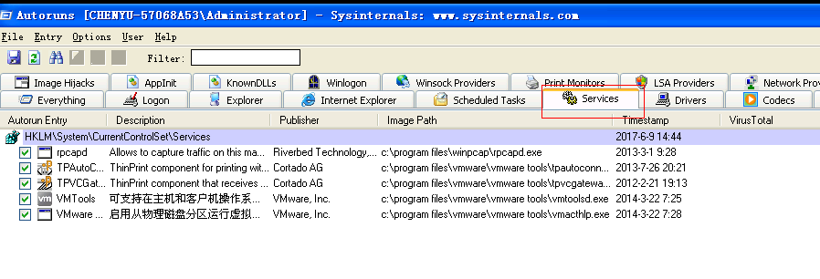 病毒也有可能是以创建服务启动项的方式保持长久运行,点击Autoruns的Services功能,如下图,检查是否有异常的服务启动项。