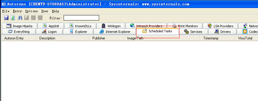如果有定时或计划任务启动项,也要检查下(点击Autoruns的Scheduled Tasks功能)。通常这一项是空白的,如下图。如果有内容,则需要排查确认是否有某些应用或服务创建了这些启动项。