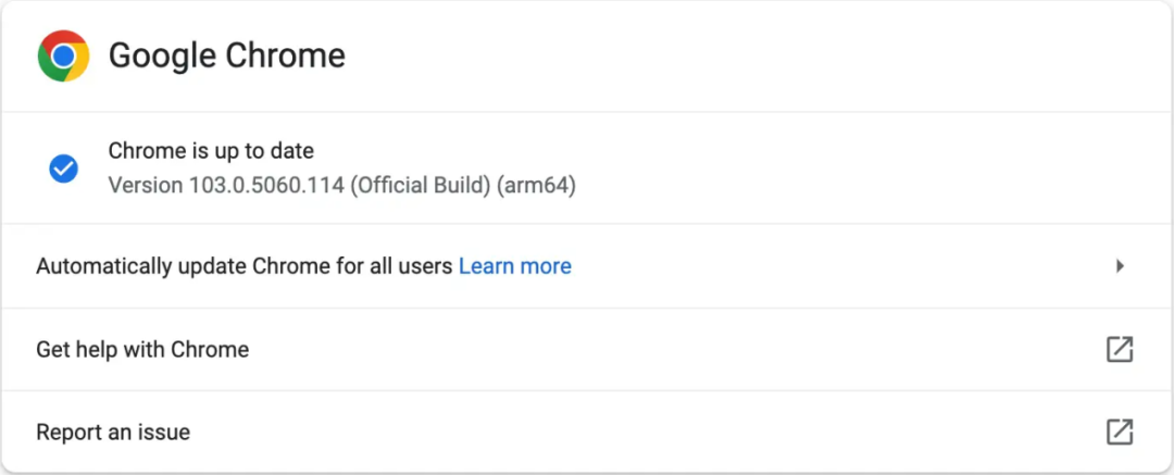 目前,Google 正向全球范围用户推出 Chrome 103.0.5060.114 紧急更新,用户可以通过 Chrome 菜单>帮助>关于Google浏览器检查新的更新,来进行更新,也可以通过以下链接获取。