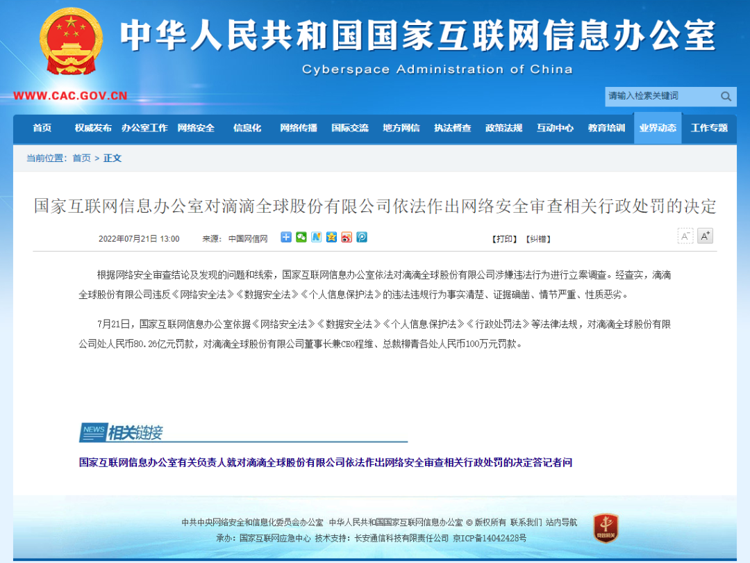 7月21日,国家互联网信息办公室依据《网络安全法》《数据安全法》《个人信息保护法》《行政处罚法》等法律法规,对滴滴全球股份有限公司处人民币80.26亿元罚款,对滴滴全球股份有限公司董事长兼CEO程维、总裁柳青各处人民币100万元罚款。