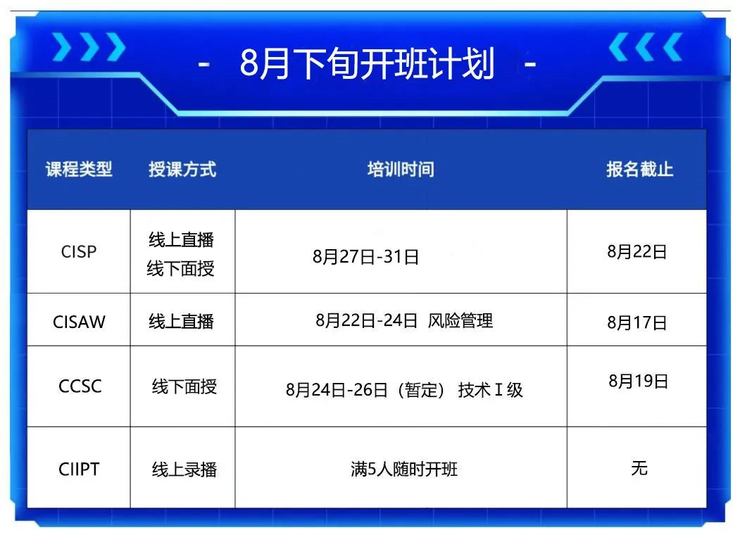 根据工信部2021年10月份发布的《网络安全人才发展报告》显示,当前国内网络安全人才的缺口高达140万。如果你也想有志于从事网络安全事业,为职业发展加分赋能,那就快来关注英国上市公司官网365信安接下来的开班计划吧!8月下旬CISP、CISAW、CCSC、CIIPT等4个课程报名正在进行中,欢迎咨询!