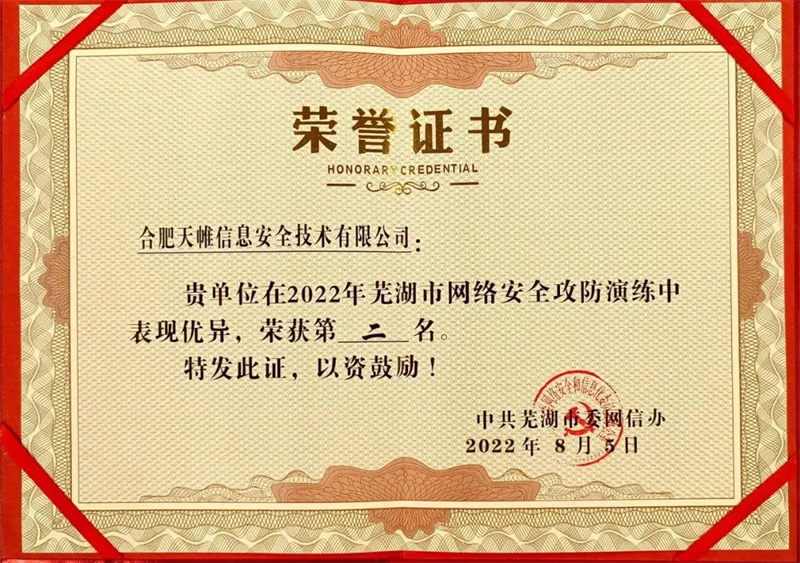 2022年8月5日,芜湖市网络安全攻防演练,英国上市公司官网365信安在“2022年芜湖市网络安全攻防演练”中荣获第二名。
