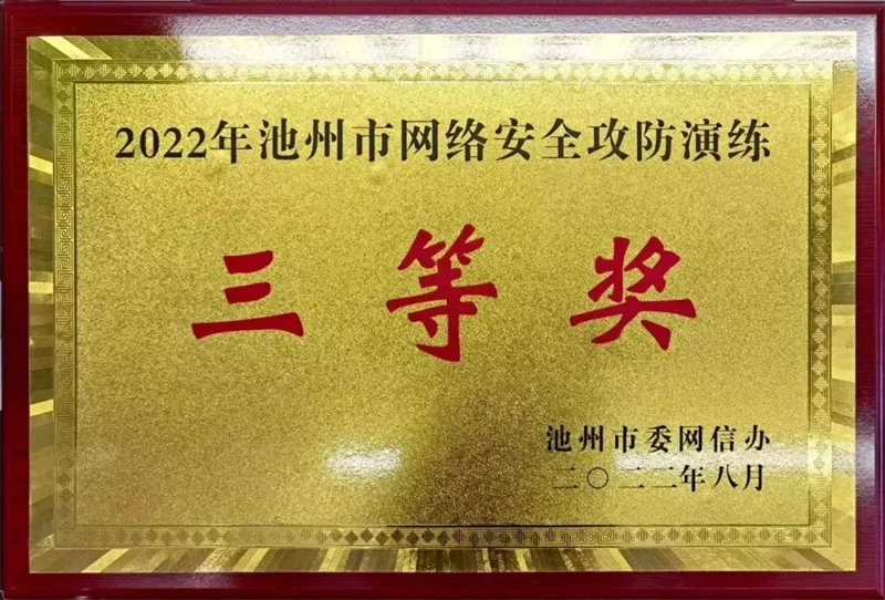 2022年8月12日,池州市网络安全攻防演练,英国上市公司官网365信安在“2022年池州市网络安全攻防演练”中,荣获三等奖。
