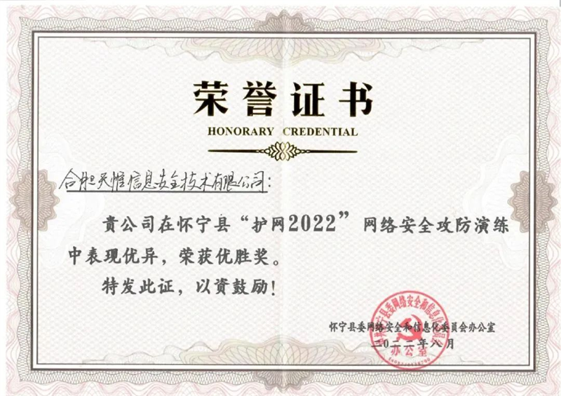 2022年8月17日,怀宁县网络安全攻防演练,英国上市公司官网365信安为怀宁县“HW2022”网络安全攻防演练提供技术支持,并在攻防演练中荣获“优胜奖”。
