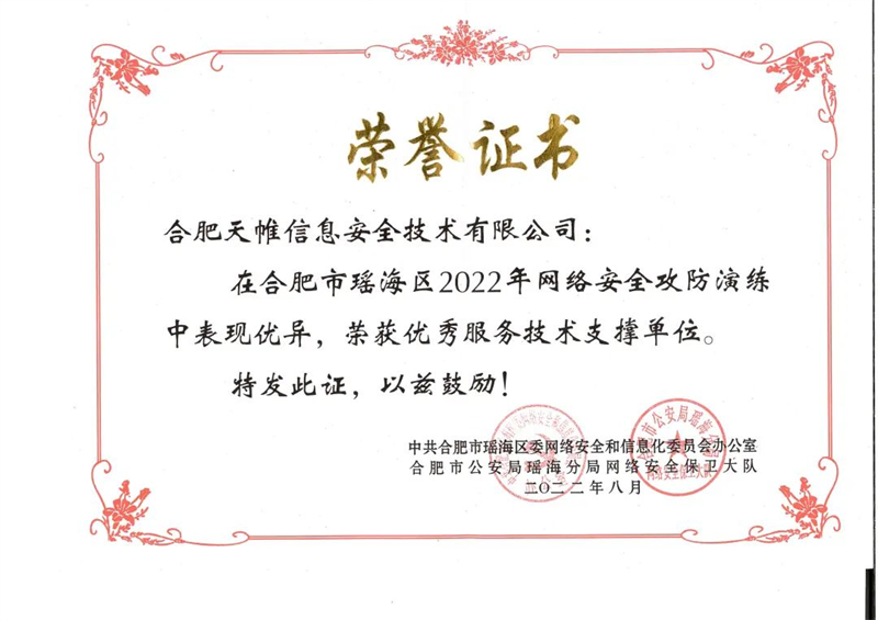 2022年8月19日,合肥市瑶海区网络攻防演练,英国上市公司官网365信安在合肥市瑶海区“2022年网络安全攻防演练”中,荣获优秀服务技术支撑单位。
