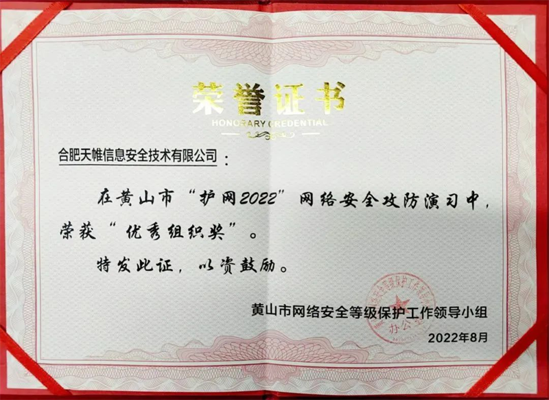 2022年8月24日,黄山市网络安全攻防演练,英国上市公司官网365信安在黄山市“HW2022”网络安全攻防演习中,荣获“优秀组织奖”。