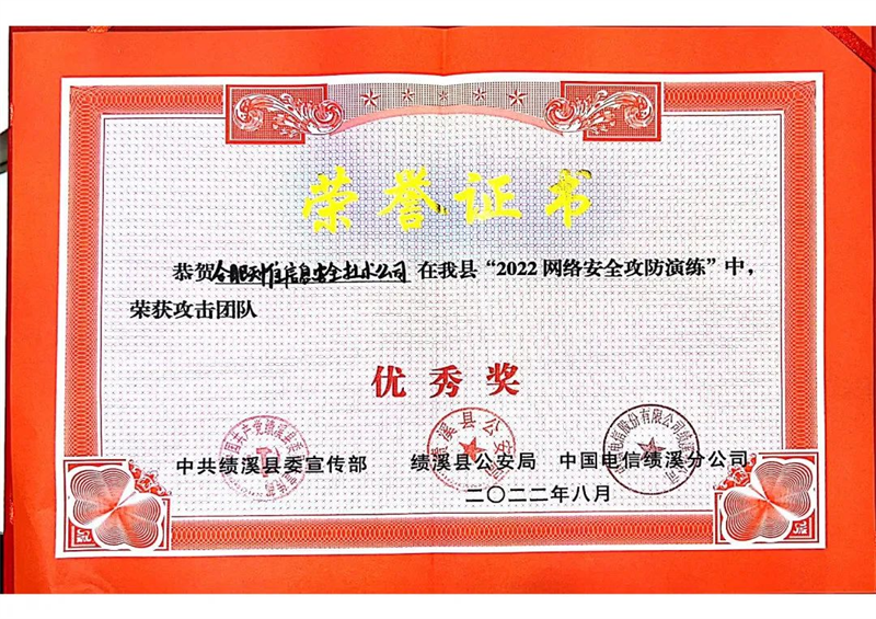 2022年8月31日,绩溪县网络攻防实战演习,英国上市公司官网365信安在绩溪县“2022网络攻防演练”中,荣获“优秀奖”。