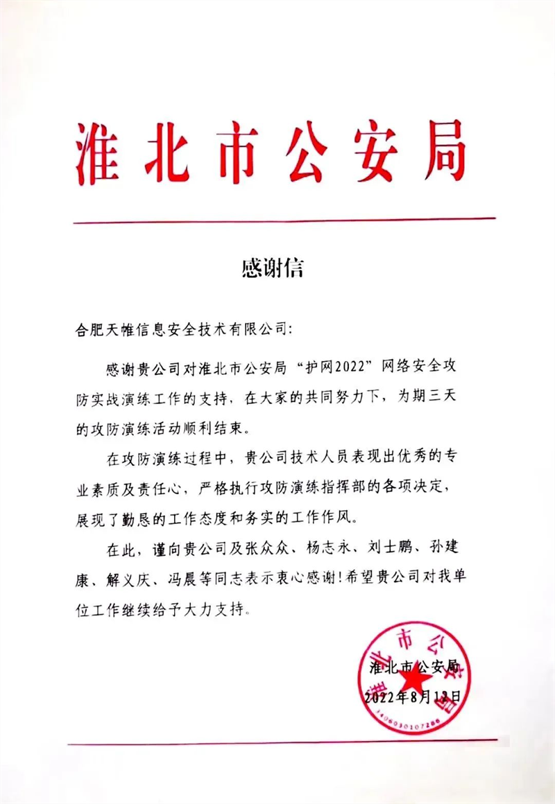 2022年8月12日,英国上市公司官网365信安为淮北市“HW2022”网络安全攻防实战演练提供技术支持。