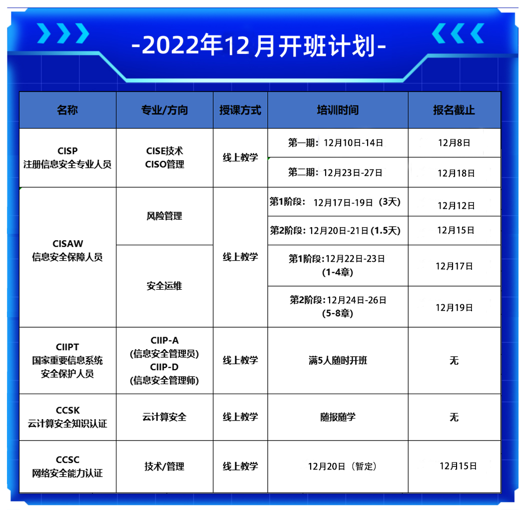 本次开设课程类型包括:CISP、CISAW(风险管理、安全运维2个方向)、CIIPT、CCSK、CCSC等5个课程,欢迎报名咨询!