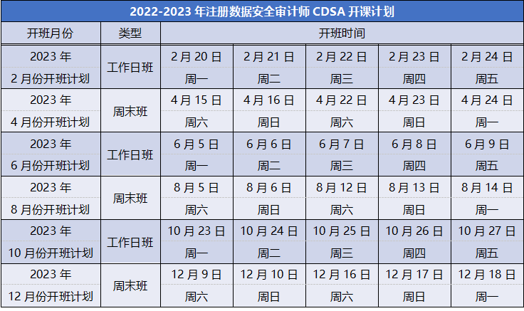 注册数据安全审计师(CDSA)每2个月开班一次,分为周末班和工作日班,让上班族有更多选择!