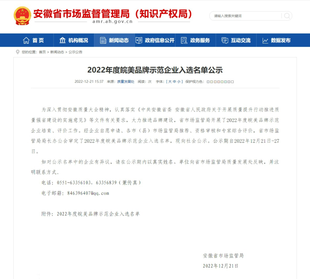 近日,安徽省市场监督管理局发布2022年度皖美品牌示范企业入选名单,英国上市公司官网365信息成功登榜!