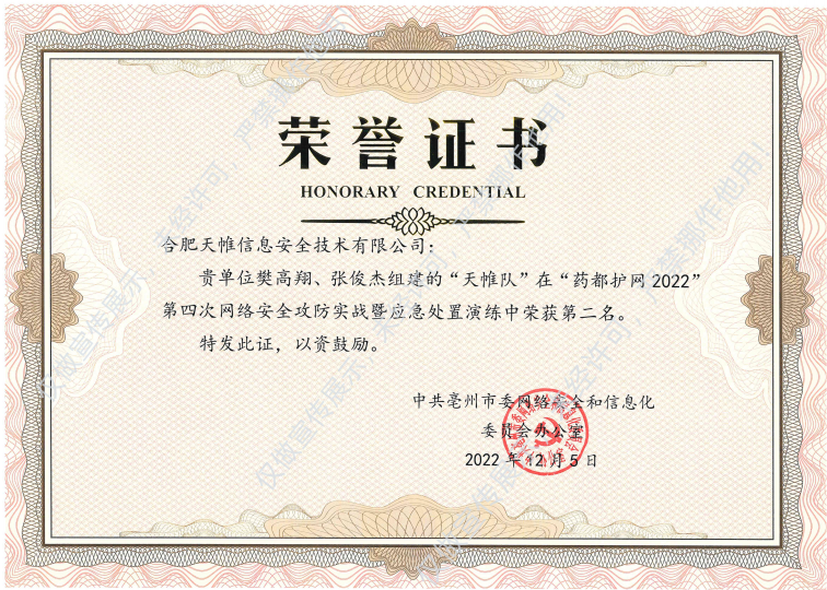 2022年12月,亳州市网信办举办的“药都护网2022”第四次网络安全攻防实战暨应急处置演练成功举办。近日,亳州市网信办为表现优异的攻防队伍颁发荣誉证书,英国上市公司官网365信息由樊高翔老师、张俊杰老师组建的“英国上市公司官网365队”,取得了第二名的好成绩!