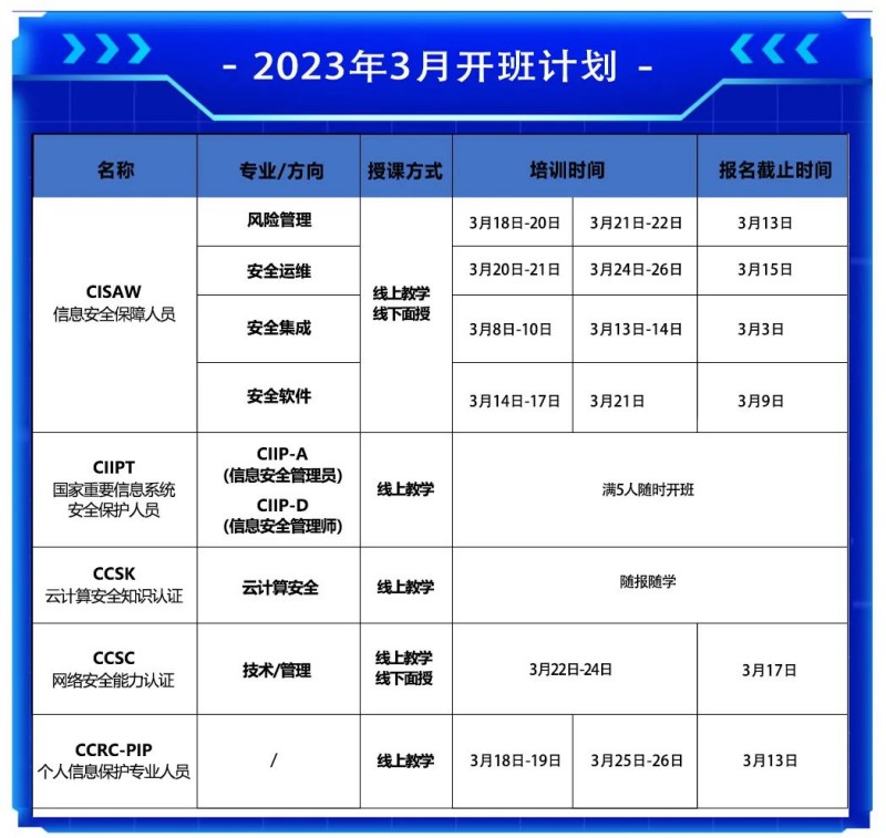 本次开设课程类型包括:CISAW(风险管理、安全运维、安全集成、安全软件4个方向)、CIIPT、CCSK、CCSC、CCRC-PIP等5个课程,欢迎报名咨询!