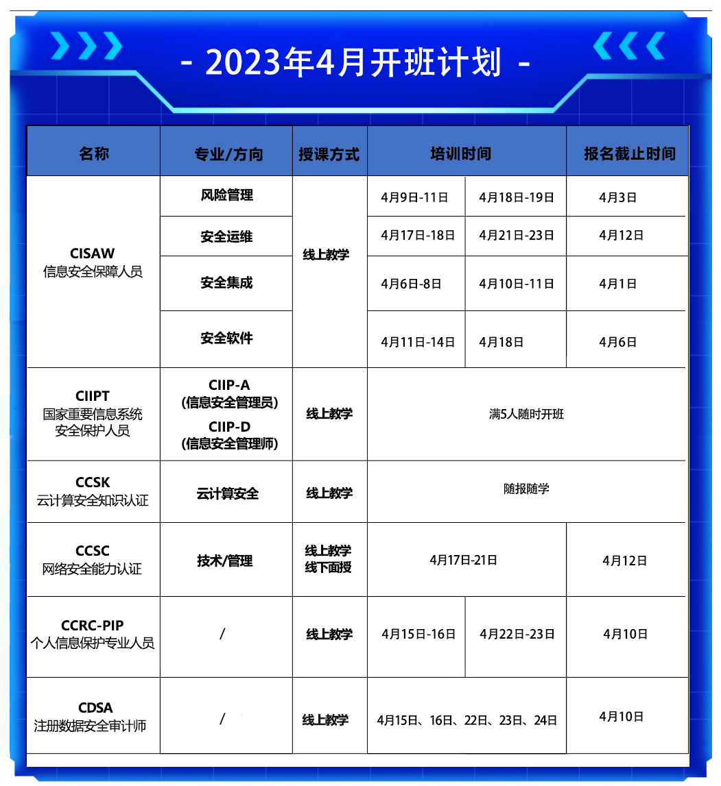 本次开设课程类型包括:CISAW(风险管理、安全运维、安全集成、安全软件4个方向)、CIIPT、CCSK、CCSC、CCRC-PIP、CDSA等6个课程,欢迎报名咨询!