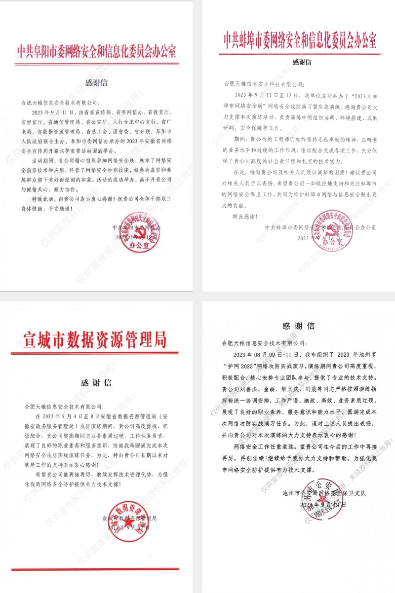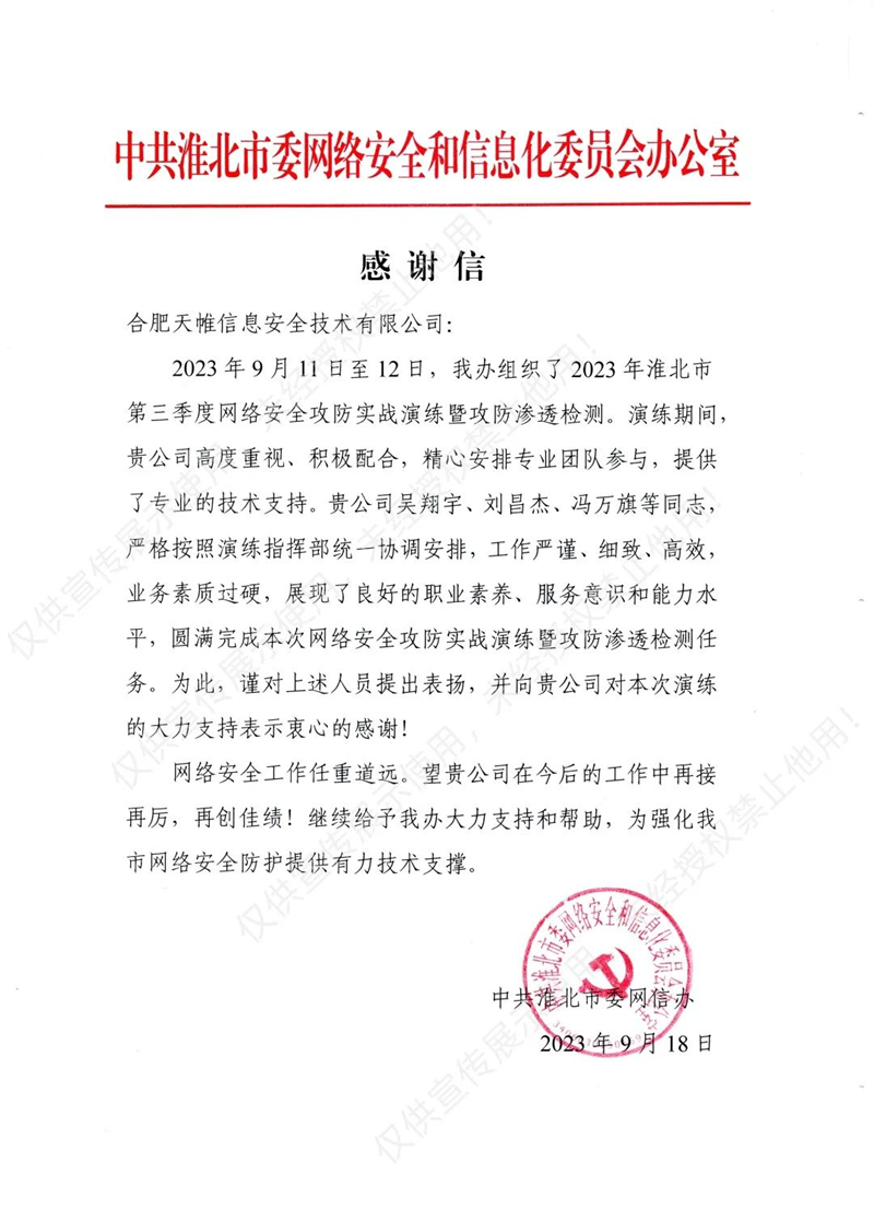 并在接下来的“2023年淮北市第三季度网络安全攻防实战演练暨攻防渗透检测”中,为活动提供技术支持,收获淮北市委网信办感谢信。