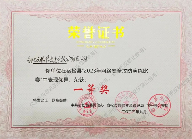 9月26日,在宿松县“2023年网络安全攻防演练比赛”活动中荣获一等奖。