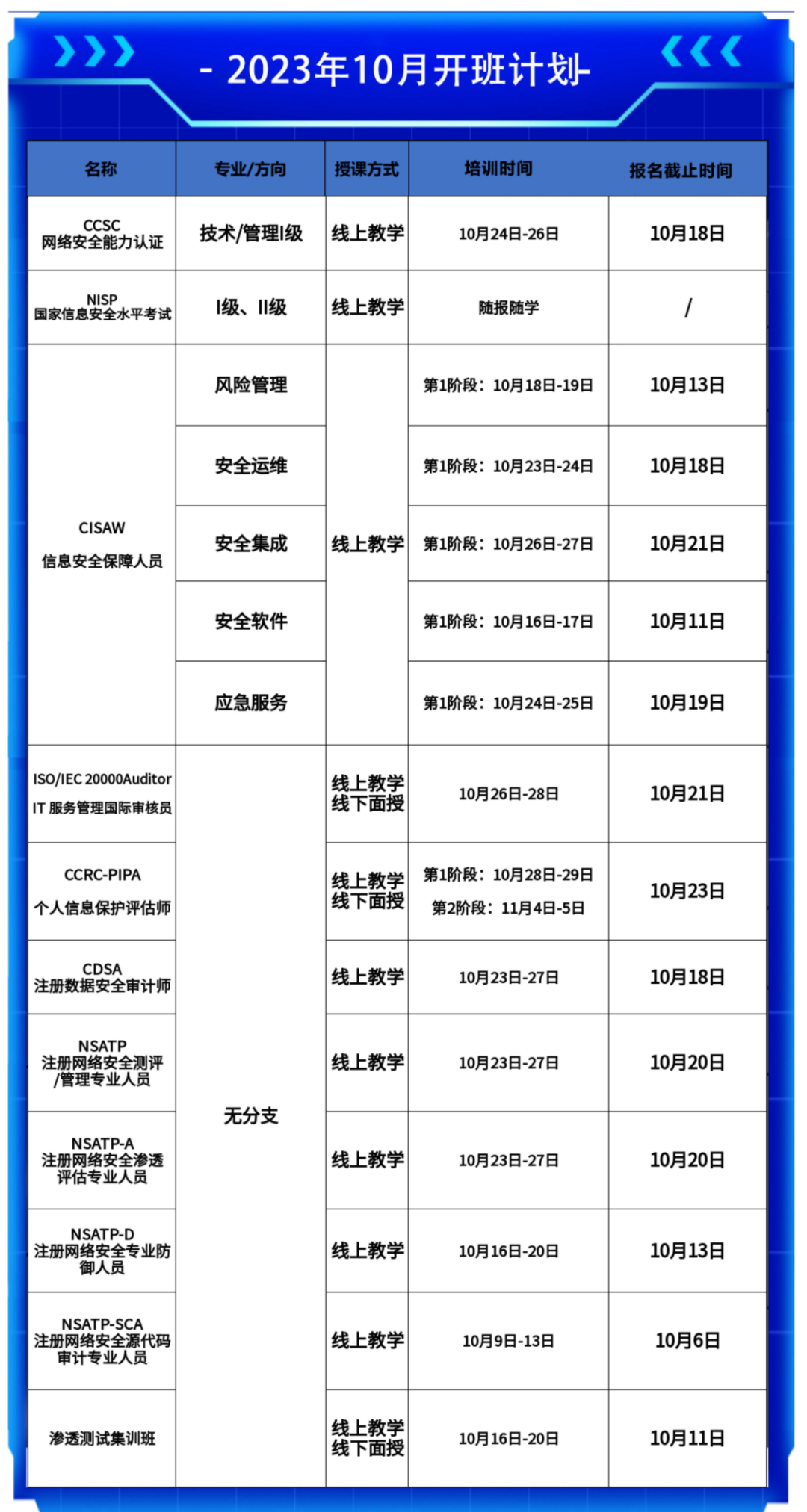 本次开设课程类型包括:CCSC、NISP、CISAW(风险管理、安全运维、安全集成、安全软件、应急服务5个方向)、ISO/IEC 20000Auditor、CCRC-PIPA、CDSA、NSATP、NSATP-A、NSATP-D、NSATP-SCA、渗透测试集训班等多个课程,欢迎报名咨询!
