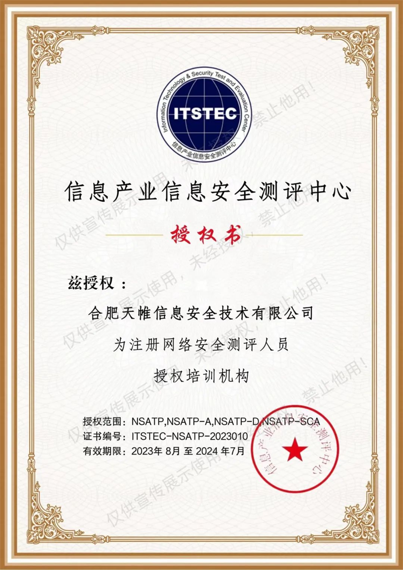注册网络安全测评专业人员(简称NSATP),认证培训内容覆盖网络安全政策法规、信息安全管理、网络安全等级保护测评、商用密码应用安全性评估、信息安全风险评估、渗透测试评估、源代码安全审计、APP安全评估以及信息技术与网络安全产品测评九个方面,培训学员可从理论到实践,从静态到动态多层次、全方位提升网络安全测评专业人员应具备的专业技能。考试合格者将获得由信息产业信息安全测评中心颁发的NSATP证书。