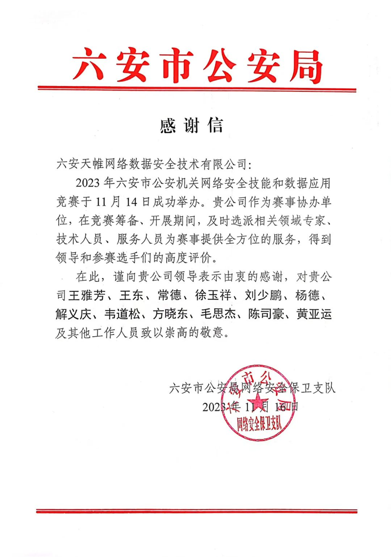 近日,2023年六安市公安机关网络安全技能和数据应用竞赛成功举办,六安英国上市公司官网365网络数据安全技术有限公司(以下简称“六安英国上市公司官网365”)作为协办单位,在竞赛筹备、开展期间,及时选派相关领域专家、技术人员、服务人员为赛事提供各项服务。