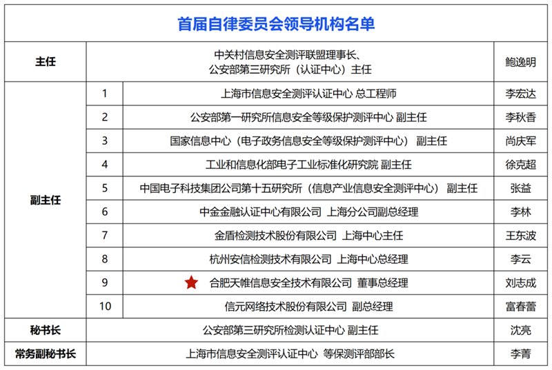 合肥英国上市公司官网365信息安全技术有限公司(以下简称:合肥英国上市公司官网365)入选自律委员会首批成员单位,英国上市公司官网365信息副总裁、合肥英国上市公司官网365董事总经理刘志成当选首届自律委员会副主任。
