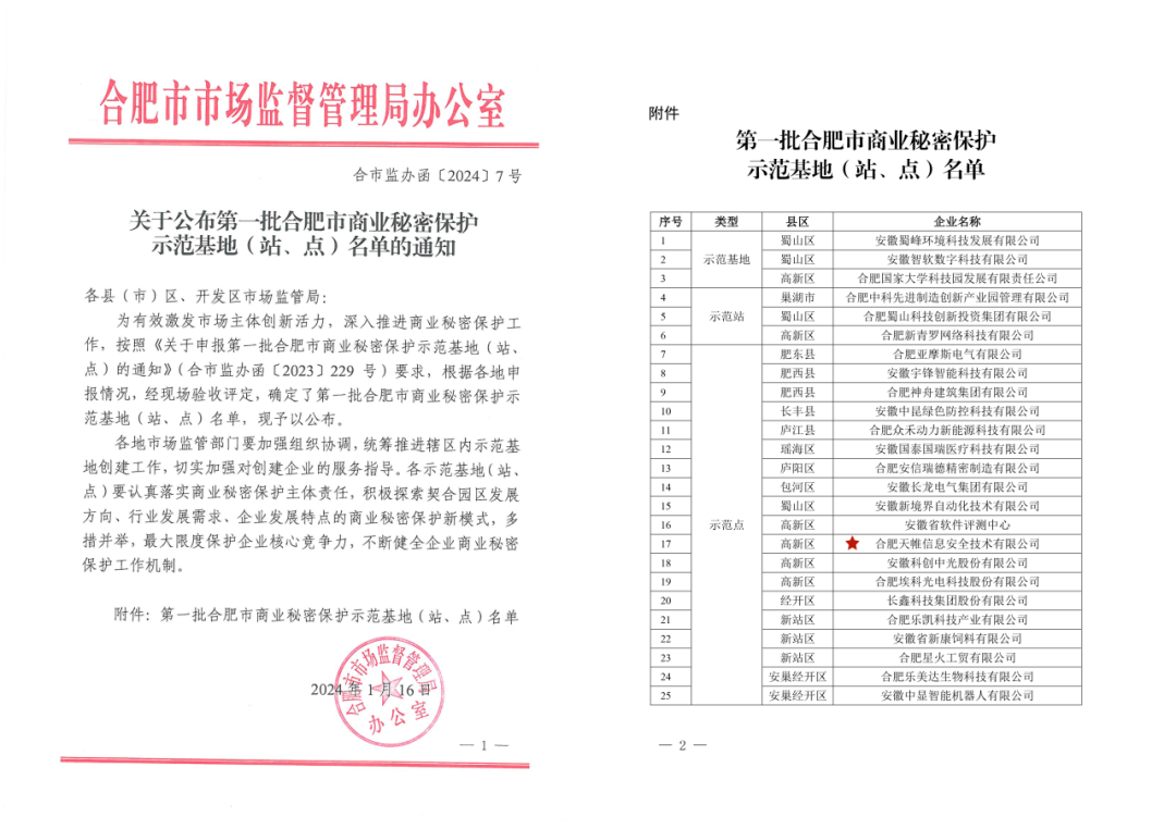 近日,合肥市市场监督管理局发布了《第一批合肥市商业秘密保护示范基地(站、点)名单》,英国上市公司官网365信息顺利通过市级商业秘密保护示范点验收,被授予合肥市商业秘密保护示范点。