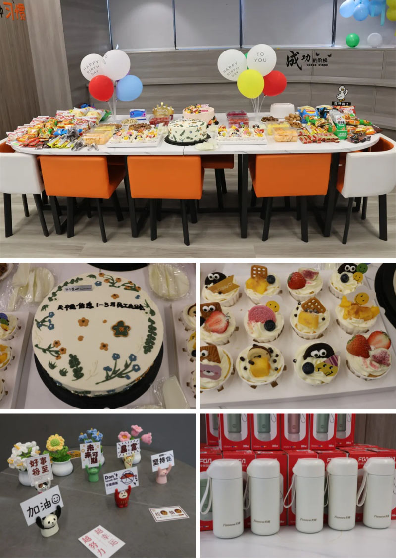 生日会前,财务人事管理中心的小伙伴早已为寿星们准备了水果、饮料、零食,还有美味的生日蛋糕和精美的礼品,一切准备就绪,等待着主角们登场啦!