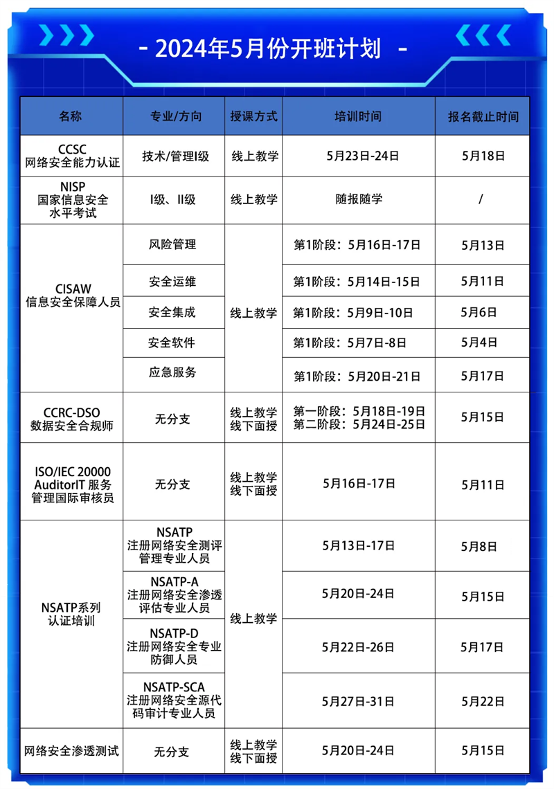 5月开设课程类型包括:CCSC、NISP、CISAW(风险管理、安全运维、安全集成、安全软件、应急服务5个方向)、CCRC-DSO、ISO/IEC 20000Auditor、NSATP、NSATP-A、NSATP-D、NSATP-SCA、网络安全渗透测试等多个课程,欢迎报名咨询!