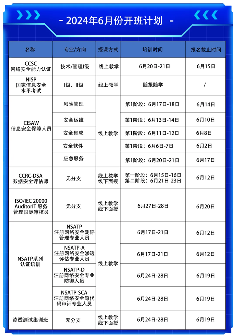 本次开设课程类型包括:CCSC、NISP、CISAW(风险管理、安全运维、安全集成、安全软件、应急服务5个方向)、CCRC-DSA、ISO/IEC 20000Auditor、NSATP、NSATP-A、NSATP-D、NSATP-SCA、网络安全渗透测试等多个课程,欢迎报名咨询!