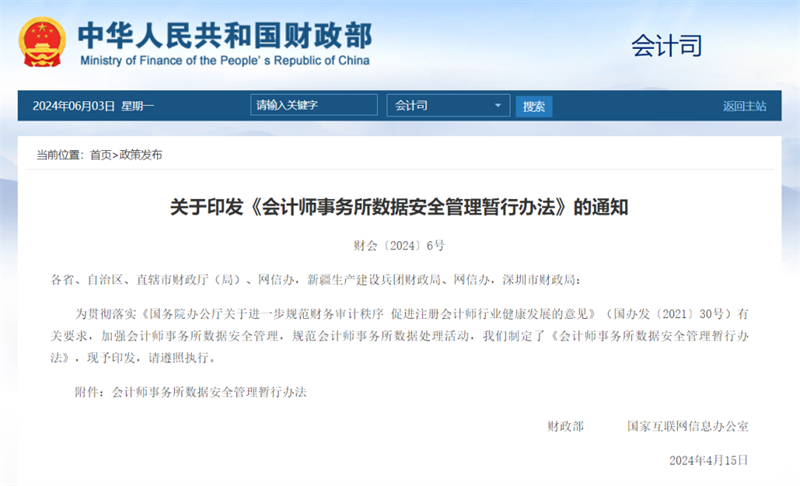 2024年5月10日,财政部、国家网信办联合印发《会计师事务所数据安全管理暂行办法》(财会〔2024〕6号,以下简称《暂行办法》),自2024年10月1日起施行。