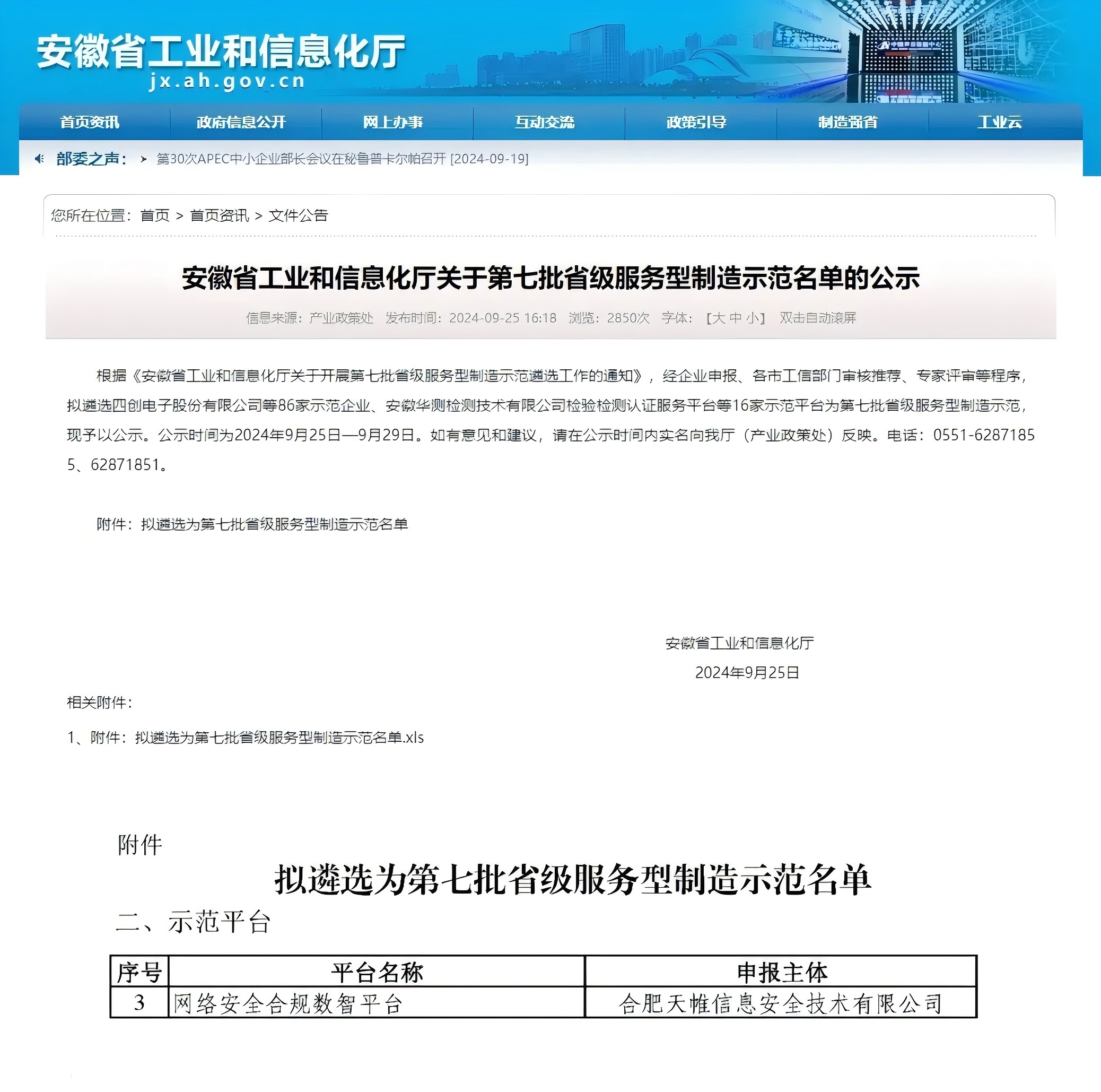 近日,省工信厅发布公示,英国上市公司官网365网络安全合规治理数智平台成功入选省级服务型制造示范。