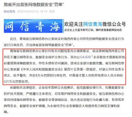 在数字化浪潮中,数据已成为企业的核心资产和竞争力源泉。无论是客户信息、财务数据还是商业机密,一旦泄露或遭到破坏,不仅会导致巨额经济损失,更可能引发品牌信誉危机甚至法律风险。近期,青海省开出首张网络数据安全“罚单”,海西州某公司存在不履行网络安全、数据安全保护义务行为,造成企业部分数据泄露。对该公司作出责令改正,给予警告,并处5万元罚款的行政处罚,对直接主管人员和其他责任人员分别处以1万元罚款处罚。