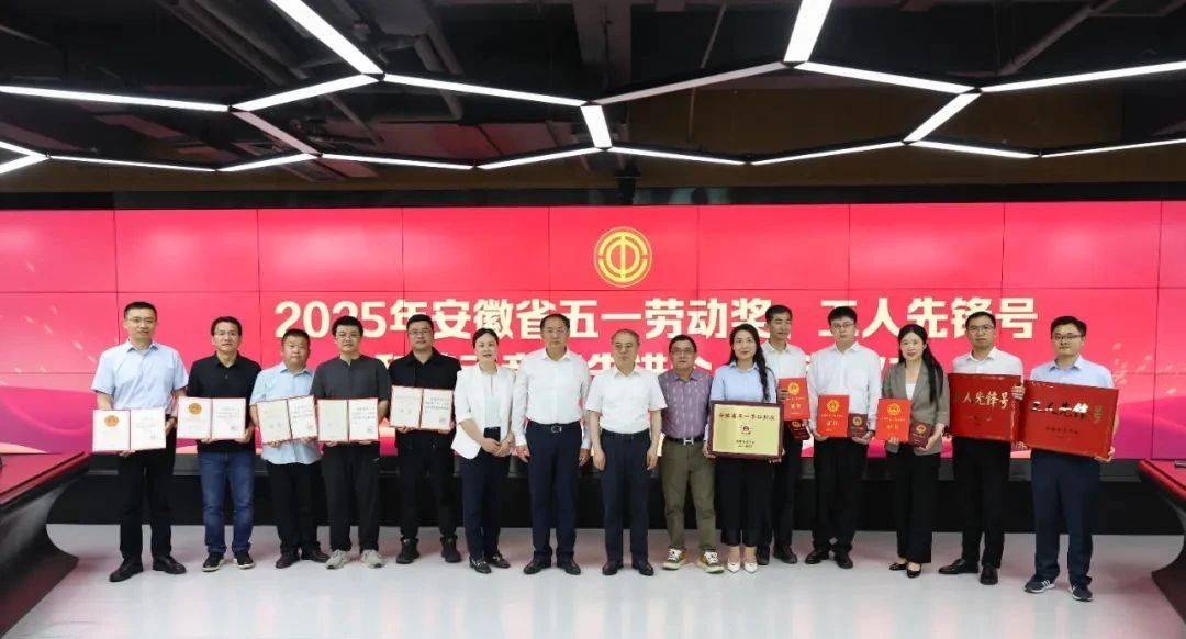 与会领导为荣获2025年省五一劳动奖、省工人先锋号和省劳动竞赛先进个人颁发荣誉奖牌和证书,余俊老师荣获安徽省劳动竞赛先进个人。