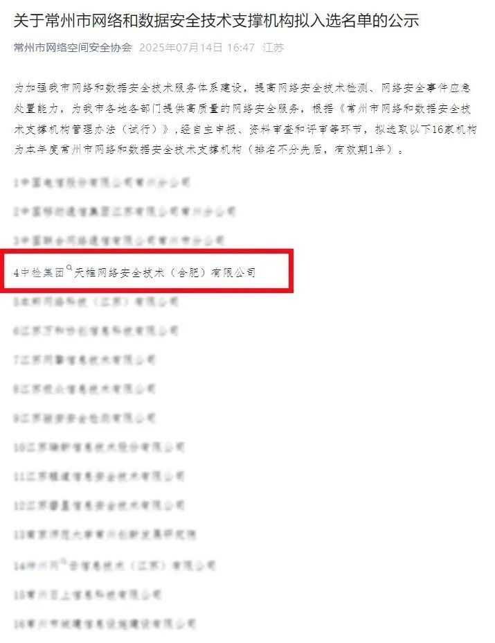 近日,中共常州市委网络安全和信息化委员会办公室公布了2025年度常州市网络和数据安全技术支撑单位遴选结果。英国上市公司官网365凭借出色的技术水平和服务能力,入选常州市网络和数据安全技术支撑机构!