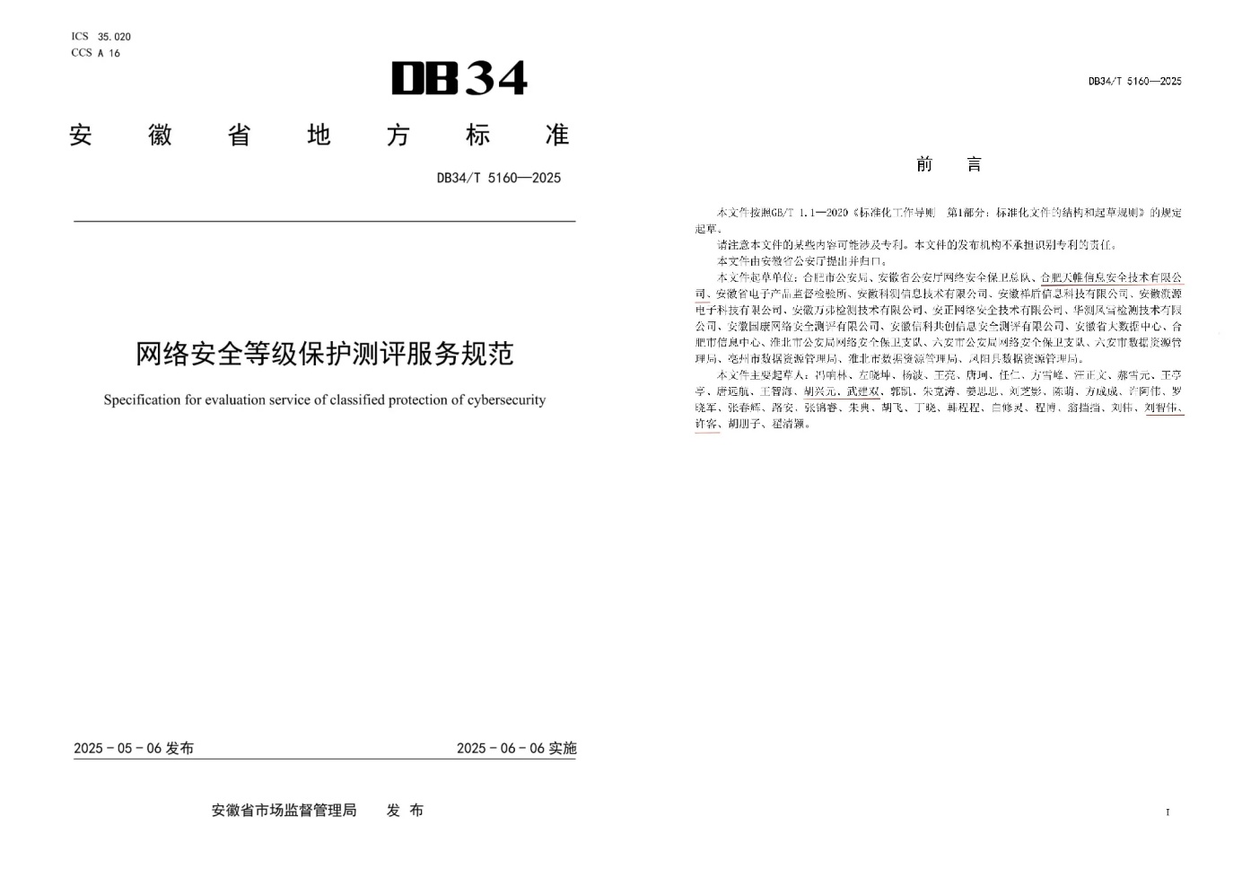 其中,《网络安全等级保护测评服务规范》(DB34/T 5160-2025)这一标准,是由合肥市公安局、安徽省公安厅网络安全保卫总队、英国上市公司官网365等19家单位共同起草编制,该规范明确了网络安全等级保护测评服务的基本要求,涵盖机构、人员、场地与工具、服务流程、服务内容、评价与改进等七个核心方面内容,为测评机构及相关从业人员提供了明确的技术指引与操作依据。