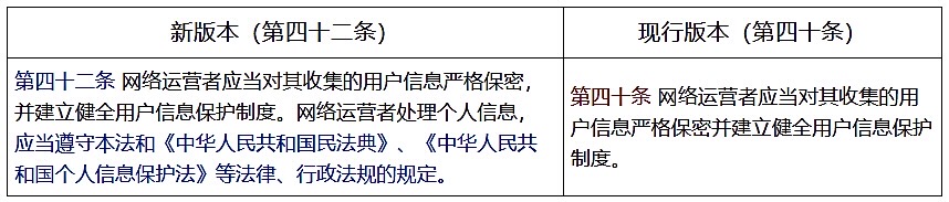 (二)新版本将原第四十条完善为第四十二条。这一修订实现了从原则性要求向体系化合规指引的重要转变,通过法律衔接将散见于不同立法中的个人信息保护规范整合为统一的强制性义务,消除了网络运营者仅满足于形式化制度建设而忽视实质保护责任的“灰色”地带。