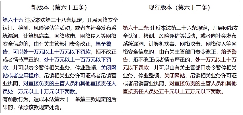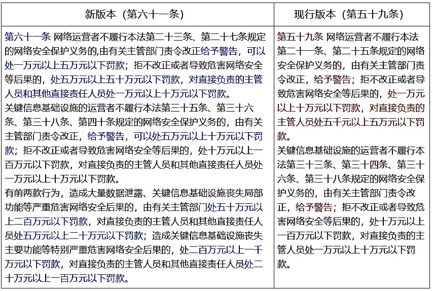 (三)新版本对第五十九条进行了修改。本次修法对违法情形进行了更为细致、具体的分级,设置了一般违法行为、加重情节违法行为和特别严重情形三个梯度,并配置差异化的罚则。对未履行网络安全责任的处罚结构进行了细化与强化: