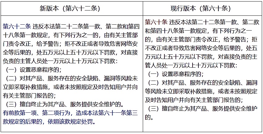 (四)将第六十条改为第六十二条,增加一款,作为第二款。规定网络产品及服务的提供者若设置恶意程序,或在其网络产品、服务中发现安全缺陷、漏洞等风险时,未立即采取补救措施,且未按相关规定及时告知用户并向有关主管部门报告,导致大量数据泄露或关键信息基础设施局部功能丧失等严重危害网络安全后果的,将由有关主管部门处以五十万元以上二百万元以下罚款;若造成关键信息基础设施主要功能丧失等特别严重危害网络安全后果的,将处以二百万元以上一千万元以下罚款。