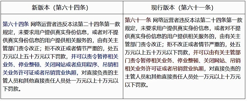 (五)新版本将第六十一条调整为第六十四条。在违反用户“实名制”的罚则部分,扩展了处罚措施所适用的服务载体。在原有“关闭网站”的基础上,增加了“或者应用程序”这一并列选项,将“应用程序”纳入监管处罚范围,使其与传统“网站”处于同等地位。这一修订确保了在网络服务主体日益移动化、App化的背景下,法律监管能够全面覆盖所有服务形态,杜绝了部分运营者可能利用不同载体逃避监管的侥幸心理。