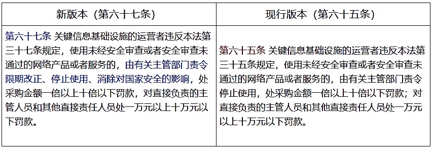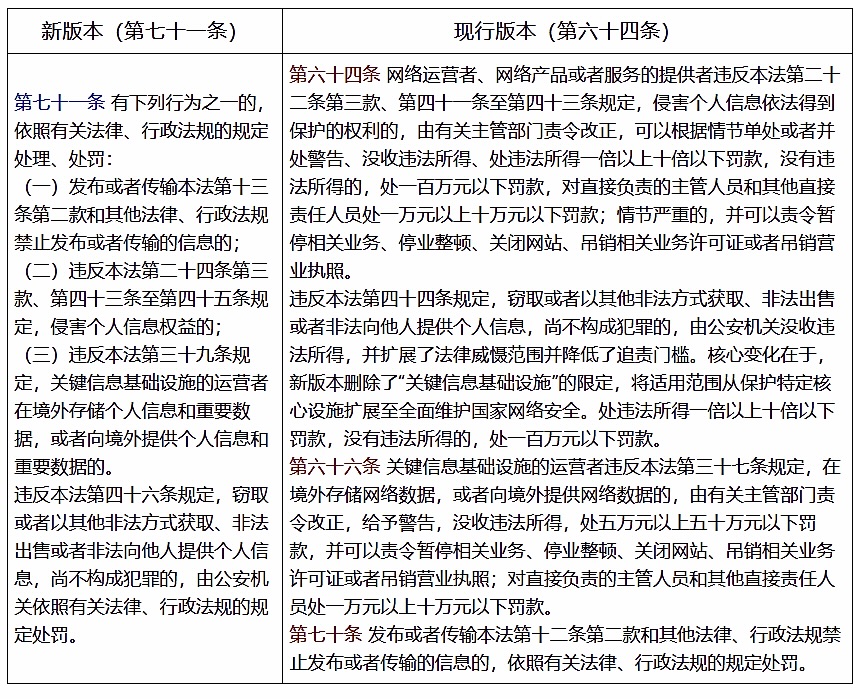 (九)新版本将第六十四条、第六十六条及第七十条合并为第七十一条。将个人信息保护的法律责任、关键信息基础设施数据跨境的法律责任、发布或者传输违法信息的法律责任合并为第七十一条,统一对上述三类行为的处理、处罚作出规定,即转致有关法律、行政法规的规定。这一修改解决了法律适用冲突问题,提高了执法效率。