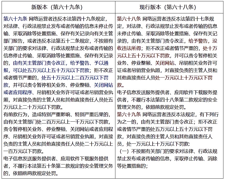 (八)新版本将原第六十八条及第六十九条的相关内容整合重构为新的第六十九条。实现了对网络运营者信息管理责任与处罚体系的全面升级,主要体现在以下几个维度:在责任体系方面进行了整合升级;处罚力度显著提升;责任追究全面深化。