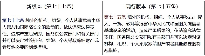 (十)新版本将第七十五条修改为第七十七条。扩展了法律威慑范围并降低了追责门槛。核心变化在于,新版本删除了“关键信息基础设施”的限定,将适用范围从保护特定核心设施扩展至全面维护国家网络安全。