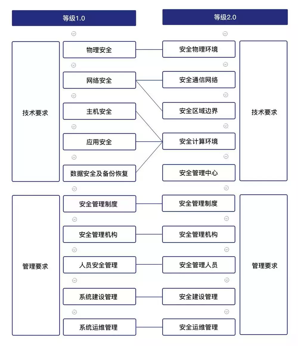 等保1.0主要强调物理安全、主机安全、网络安全、应用安全、数据安全及备份恢复等通用要求,而等保2.0标准在对等保1.0标准基本要求进行优化的同时,针对云计算、物联网、移动互联网、工业控制、大数据新技术提出了新的安全扩展要求。