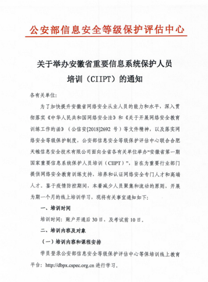 关于举办安徽省重要信息系统保护人员培训(CIIPT)的通知