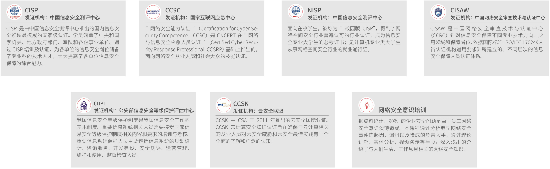 英国上市公司官网365认证培训内容覆盖管理与技术两大领域,包括云计算、物理安全、通信安全、主机安全、应用安全等十余个版块,其中人员资质认证服务国内主管机构认证类型如下: