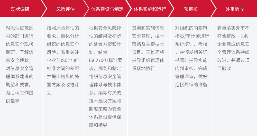 信息安全管理体系咨询主要依据ISO/IEC 27001信息安全管理体系标准要求,通过对客户现状的调研分析,发现信息安全管理存在的差距问题,以及存在的信息安全风险,针对主要的问题和风险制定管理、技术措施,并通过持续的运行、检查和改进,帮助客户进行制度落地,并在时机成熟的情况下,组织并通过外部认证,获取信息安全管理体系认证证书。