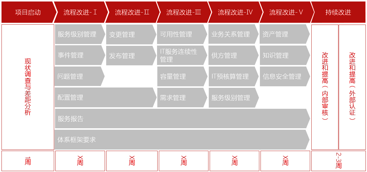 运维管理体系咨询需要经过前期的准备、调研、培训(动员会、ISO20000标准培训、体系文件编写培训)、文件编写、体系建立(体系文件编写、修改、发布)、体系运行、内部审核、管理评审、外部认证。